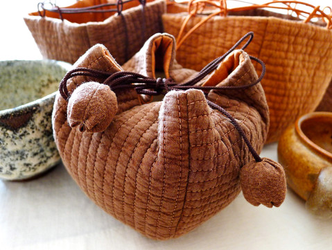 우림이와 식힘이, 보듬이를 담는 싸개도 그렇다. 수년 전 구르다팀은 차살림 퍼포먼스를 위해 유럽으로 여행을 갔었다. 한 달의 긴 여행에서 기물들을 보호해 줄 싸개가 필요했다. 평비 선생은 촉박한 기간에 밤잠을 설쳐가며 작품을 만들어 주었다. 이곳저곳 떠도는 동안, 보자기처럼 묶고 풀고 하는 과정의 번거로움을 피하되 찻자리의 멋을 잃지 않게끔 단정한 싸개를 고안해내었다. 도톰한 천 안팎으로 수천 번의 침공(針工)이 녹아 있다. 안팎으로 뒤집어 보아도 꼼꼼한 바늘땀이며 매무새가 한결같다. 시침과 본봉이 정교하게 짜여 있어 십 년을 써도 모양이 변하지 않는다. 무심한 듯 보이는 선과 면 안에 숨겨둔 것은 작가의 깊은 헤아림이다. 쓰임을 두루 살펴 부족함이 없게 하되, 쓰임 없이 겉치레는 하지 않으니 정갈하다.